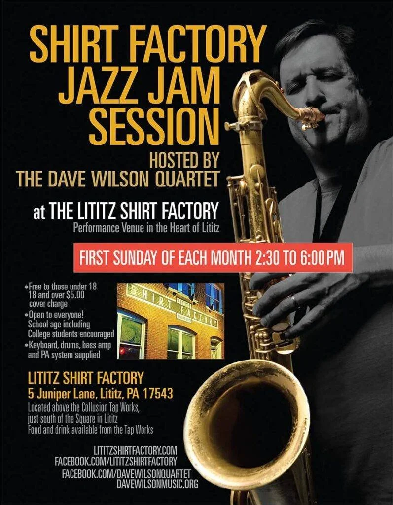 Shirt Factory Jazz Jam Session Sunday, September 6, 2026 2:30 PM 6:00 PM Lititz Shirt Factory 5 Juniper Lane Lititz, PA, 17543 United States (map) Google Calendar ICS Every 1st Sunday of the month, we welcome jazz musicians and jazz singers to jam on The Shirt Factory Stage. 2:30 pm to 6:00 pm. $5 dollar cover charge. Students free.Pay at door.